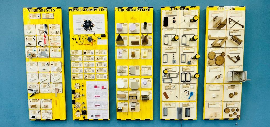 Wenn Schülerinnen an ihren eigenen Projekten arbeiten, benötigen sie meist individuelle Hilfestellungen von der Lehrperson. Je nach Grösse der Lerngruppe müssen sich die Schülerinnen auf Wartezeiten einstellen. Entlastung können MakerBoards bringen. MakerBoards hängen im MakerSpace und bieten 3 dimensionale Standardlösungen und Umsetzungsbeispiele für besonders häufig benötigte Konstruktionen. Bei Bedarf können die Schüler*innendirekt am MakerBoard nachschauen, wie sich einbestimmtes Konstruktionsproblem lösen lässt.