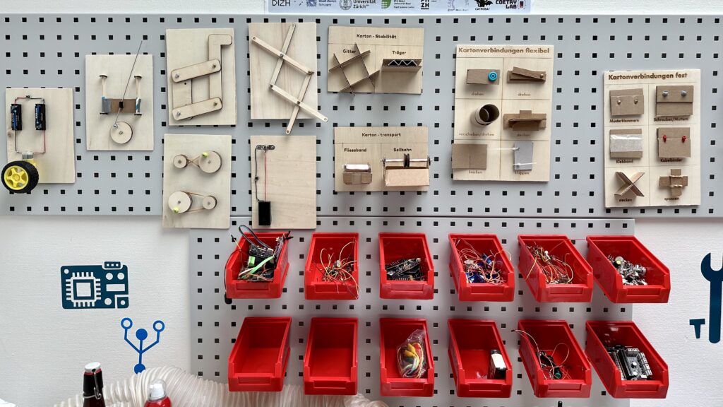 Wenn Schülerinnen an ihren eigenen Projekten arbeiten, benötigen sie meist individuelle Hilfestellungen von der Lehrperson. Je nach Grösse der Lerngruppe müssen sich die Schülerinnen auf Wartezeiten einstellen. Entlastung können MakerBoards bringen. MakerBoards hängen im MakerSpace und bieten 3 dimensionale Standardlösungen und Umsetzungsbeispiele für besonders häufig benötigte Konstruktionen. Bei Bedarf können die Schüler*innendirekt am MakerBoard nachschauen, wie sich einbestimmtes Konstruktionsproblem lösen lässt.